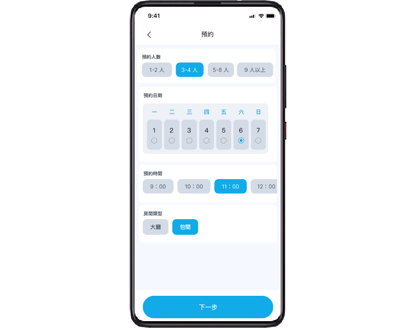 全时段预约管理:支持客户自主选择人数、日期及精确时段预订